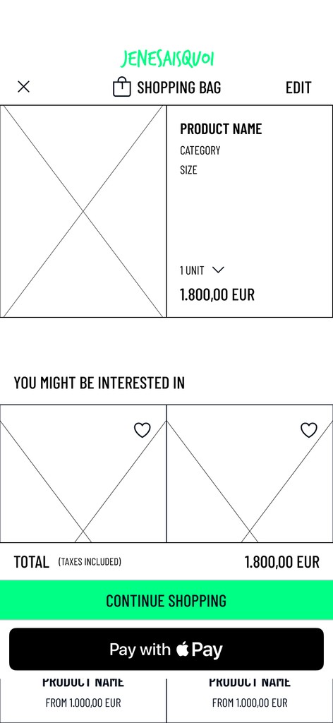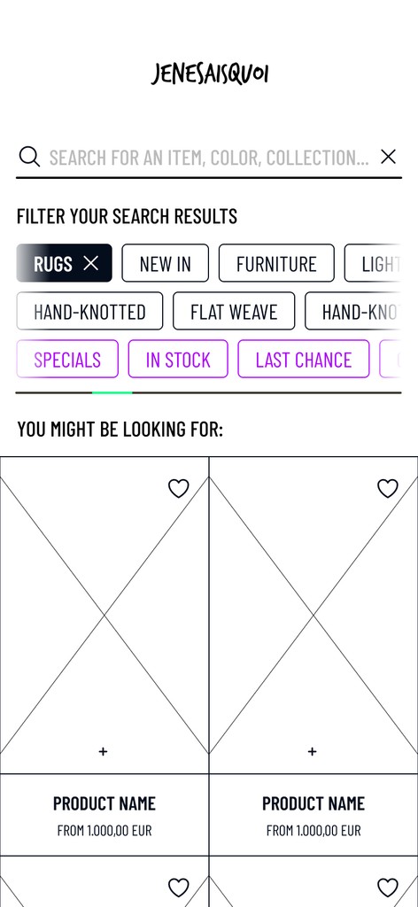 Jenesaisquoi is a conceptual e-commerce brand. This project focused on creating an interactive prototype, built with a design system, specifically tailored to enhance the user experience based on a user story.